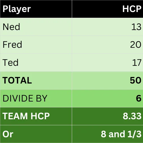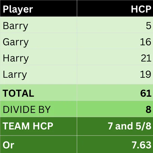 Your team playing handicap is determined by adding all individual handicaps and dividing by EIGHT (for 4-man teams) or SIX (for 3-man teams). This handicap must be recorded on your card. Handicap calculation examples are at the bottom of this page
